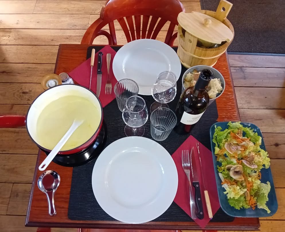 (Cèpes, ail, vin blanc, beaufort, comté, emmental ; servie avec croûtons, pommes de terre et salade verte)