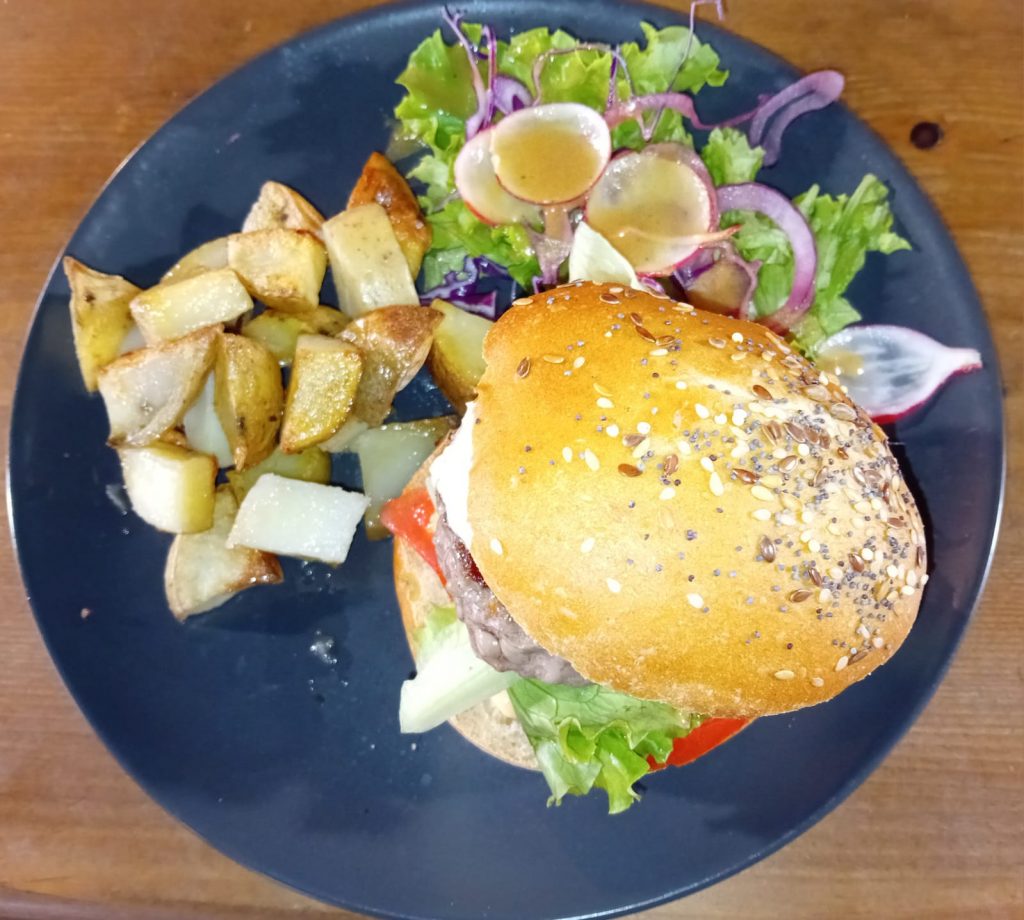 (Pain burger, sauce burger, galette de pommes de terre, confit d’oignons rouges, fromage à raclette, salade verte et oignons frits ; servi avec pommes de terre et salade verte)