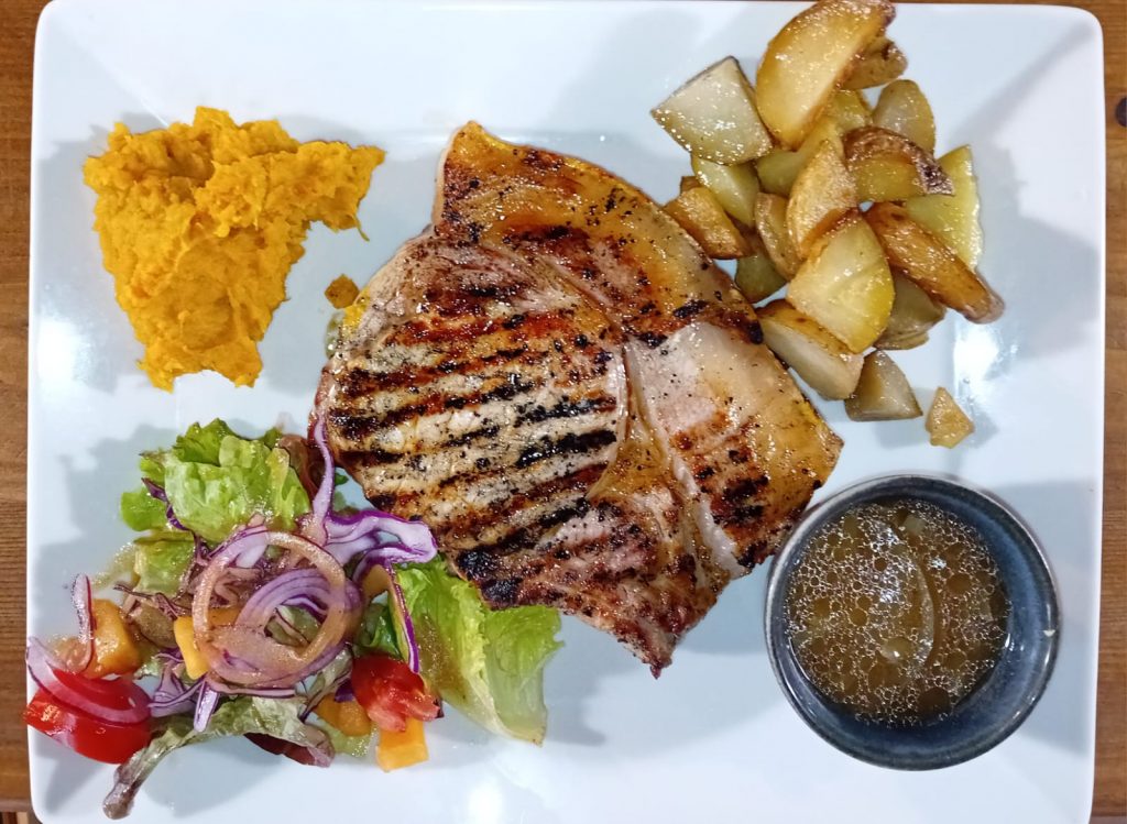 (Sauce poivre ou gorgonzola ; servie avec pommes de terres, légumes et salade verte)