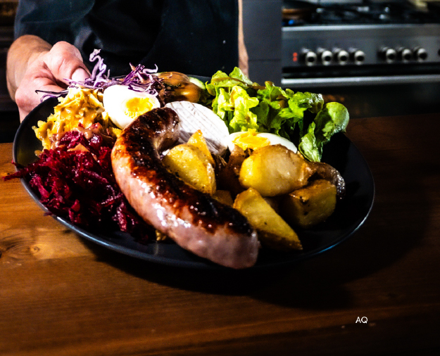 (Pain burger, sauce burger, steak haché, confit d’oignons rouges, fromage à raclette, salade verte et oignons frits ; servi avec pommes de terre et salade verte)